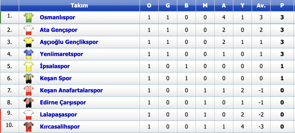 Edirne Süper Amatör Ligi 1. Hafta Puan Durumu