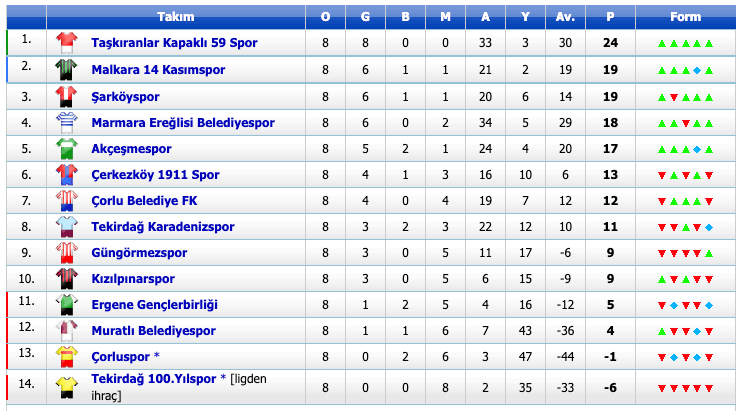8. hafta itibarıyla Taşkıranlar Kapaklı 59 Spor 24 puanla namağlup liderliğini sürdürürken, Malkara 14 Kasımspor ve Şarköyspor 19’ar puanla zirve takibini sürdürüyor. Ligde alt sıralarda ise Çorluspor ve Muratlı Belediyespor galibiyetle tanışamazken, Tekirdağ 100.Yılspor ligden ihraç edilmiş durumda. Ligin bu dengeli ve çekişmeli yapısı, önümüzdeki haftalarda daha da heyecan verici karşılaşmalara sahne olacak gibi görünüyor.