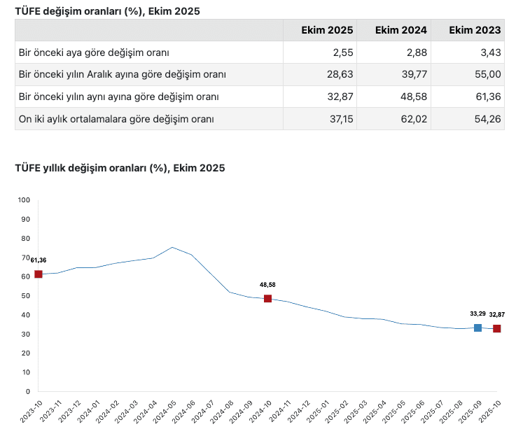 TÜİK’in verilerine göre geçmiş yıllarla karşılaştırıldığında, 2023 Ekim ayında %61,36 olan yıllık TÜFE, 2024’te %48,58’e ve 2025’te %32,87’ye gerileyerek enflasyonda düşüş eğiliminin sürdüğünü gösterdi.