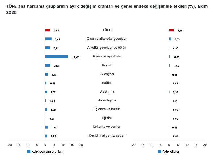 Aylık TÜFE değişiminde en dikkat çeken grup %12,42 artışla giyim ve ayakkabı oldu. Bu oran, mevsim geçişlerinin etkisiyle beklentileri aşan bir yükselişe işaret etti. Ayrıca;